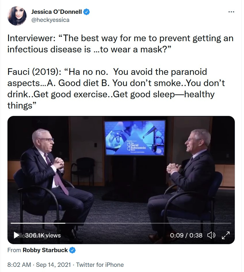 Watch the video to see how when masks are mentioned, he immediately says “No, no, no” with a laugh. He mentions avoid the paranoia later. There is a direct link below the picture.