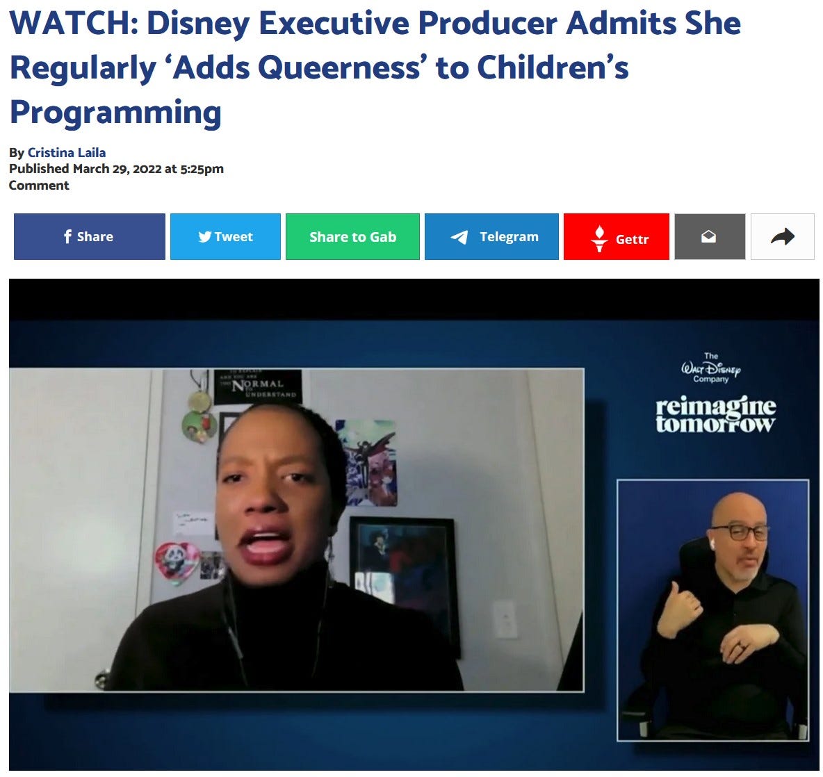 You know, Disney, where they apparently have over a hundred employees who are various types of deviants. They’re all upset that Florida has just passed an anti child grooming law. One that actually doesn’t go nearly far enough. Well now you’ve got a Disney executive producer admitting that she’s “adding queerness” to children’s programming: